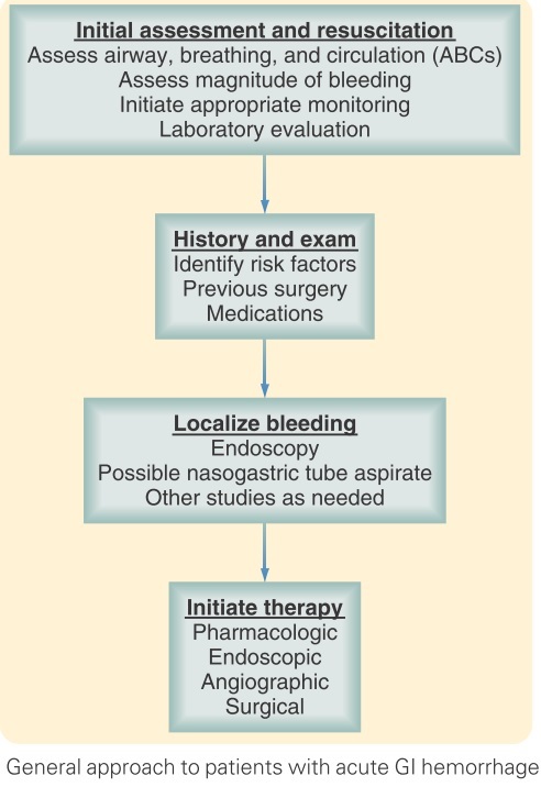 Yukarıdaki algoritma genel tedavi yaklaşımını gösterir. Daha önce belirtildiği gibi, klinik olarak bir GIS kanaması kanıtı olan hastalara 24 saat içinde bir endoskopi yapılmalı ve EGD'yi beklerken bir PPI ile tedavi edilmelidir. Bu yaklaşımın endeks endoskopideki son kanama stigmalarını azalttığı gösterilmiş olmasına rağmen, transfüzyon gereksinimleri, mortalite veya cerrahi ihtiyaç gibi klinik sonuçlar üzerinde bir etkisi olmamıştır; Buna rağmen, üst GI kanaması olduğundan şüphelenilen kişilerin maliyet etkin bir müdahalesi olduğuna inanılmaktadır(15).