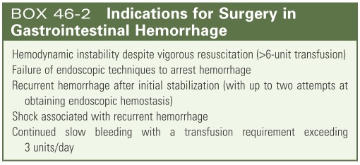 Peptik ülser kanaması için güncel ameliyat endikasyonlar üstteki Kutu 46-2'de özetlenmiştir. Sekonder veya göreceli endikasyonlar: