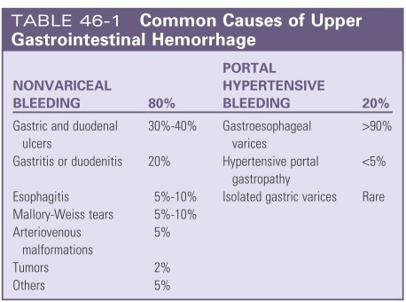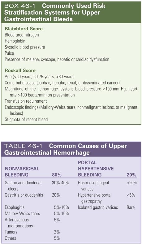 Yaygın olarak kullanılan skorlama sistemleri endoskopik bulguları dikkate alan Rockall skoru ve endoskopik veri gerektirmeyen ve ilk değerlendirme sırasında kullanılabilecek Blatchford skoru' dur. Sol tarafta Kutu 46-1, bu skorlama sistemlerini özetlemektedir.