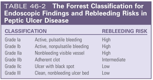 Forrest sınıflaması, bu riski endoskopik bulgular temelinde değerlendirmek ve hastaları düşük, orta ve yüksek risk gruplarına ayırmak amacıyla geliştirilmiştir (Tablo 46-2). Endoskopik tedavi, aktif kanama durumlarında ve görünür bir damar için önerilmektedir (Forrest I-IIa). Yapışkan bir pıhtı durumunda (Forrest IIb), pıhtı çıkarılır ve altta yatan lezyon değerlendirilir. Hematin birikimine ikincil olarak temiz bir tabanı veya siyah noktası olan ülserler genellikle endoskopik olarak tedavi edilmez. Üst GI kanaması için EGD uygulanan hastaların yaklaşık% 25'i endoskopik girişim gerektirir(14).