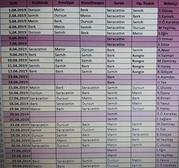 NİSAN 2019 ASİSTAN NÖBET PROGRAMI