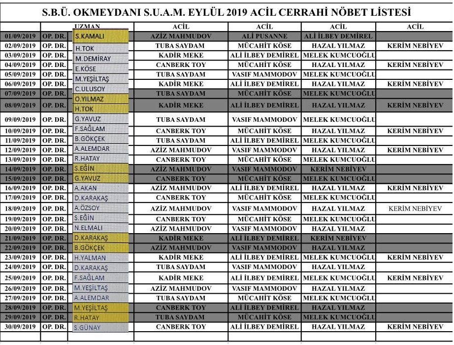 EYLÜL 2019 ASİSTAN NÖBET PROGRAMI