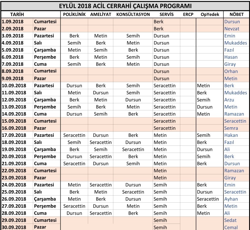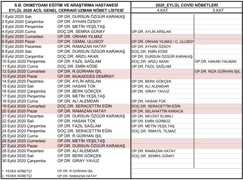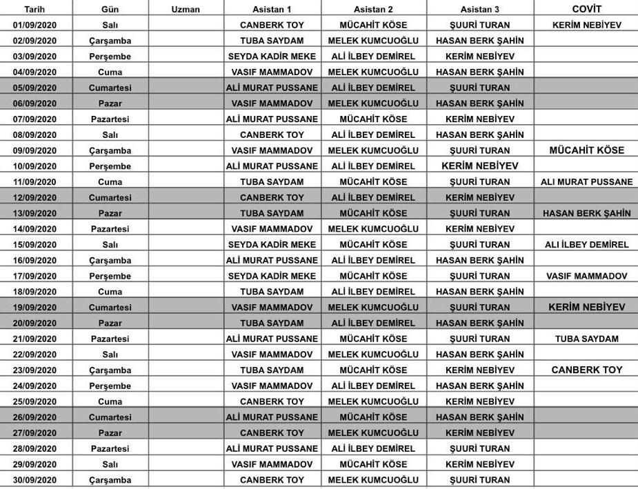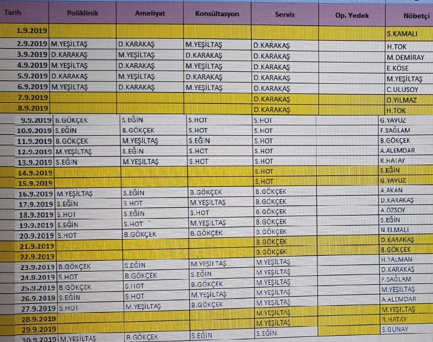EYLÜL 2019 ASİSTAN NÖBET PROGRAMI