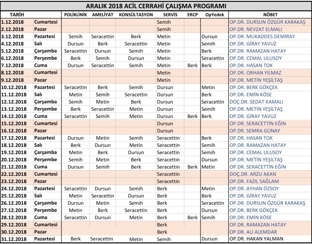 ARALIK 2018 ÇALIŞMA PROGRAMI