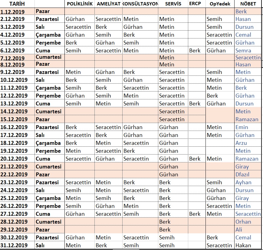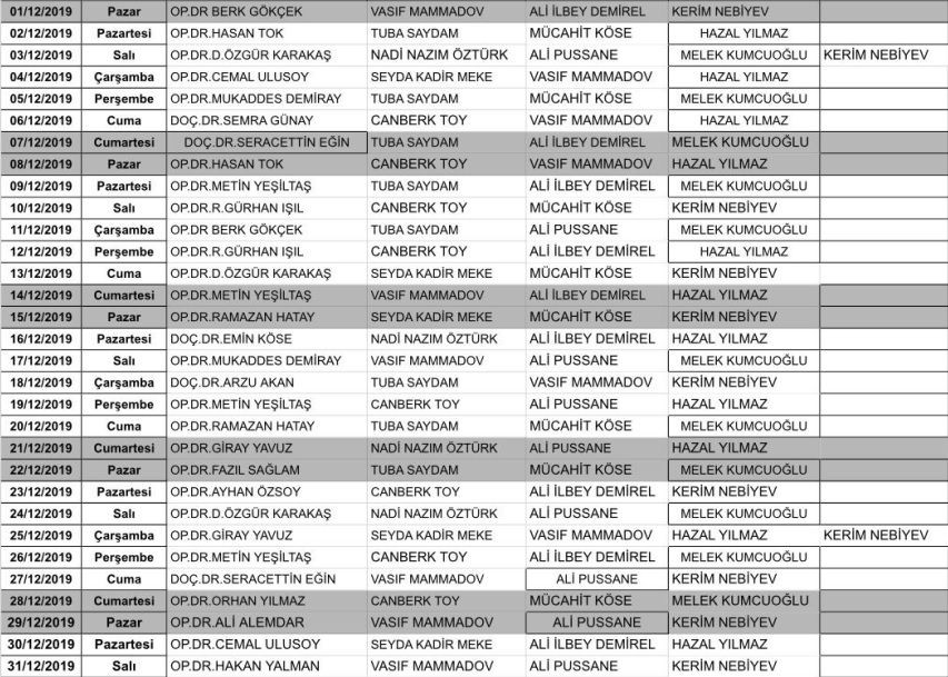 ARALIK 2019 ASİSTAN NÖBET PROGRAMI