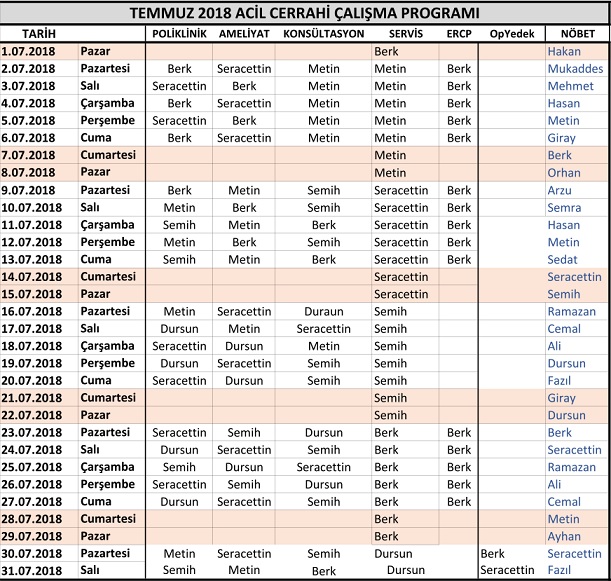 TEMMUZ 2018 ÇALIŞMA PROGRAMI