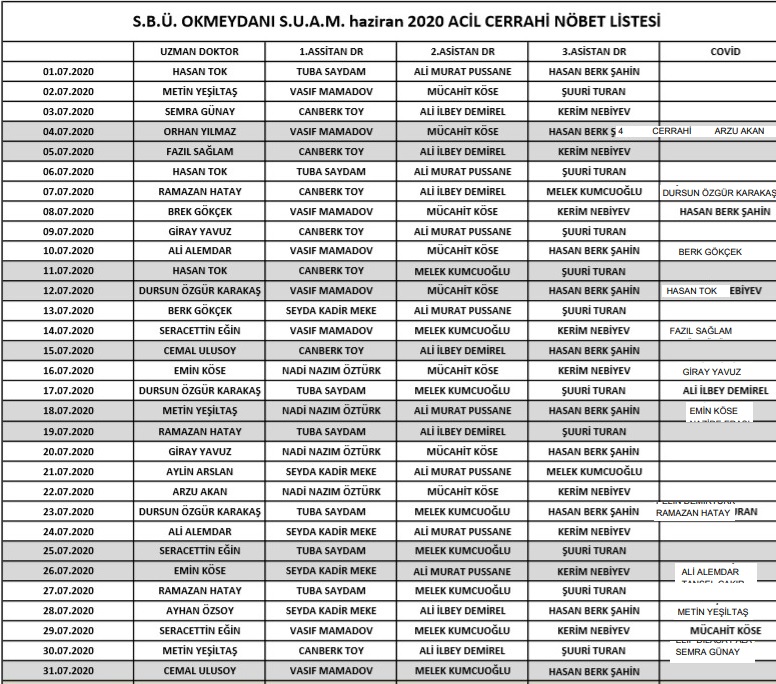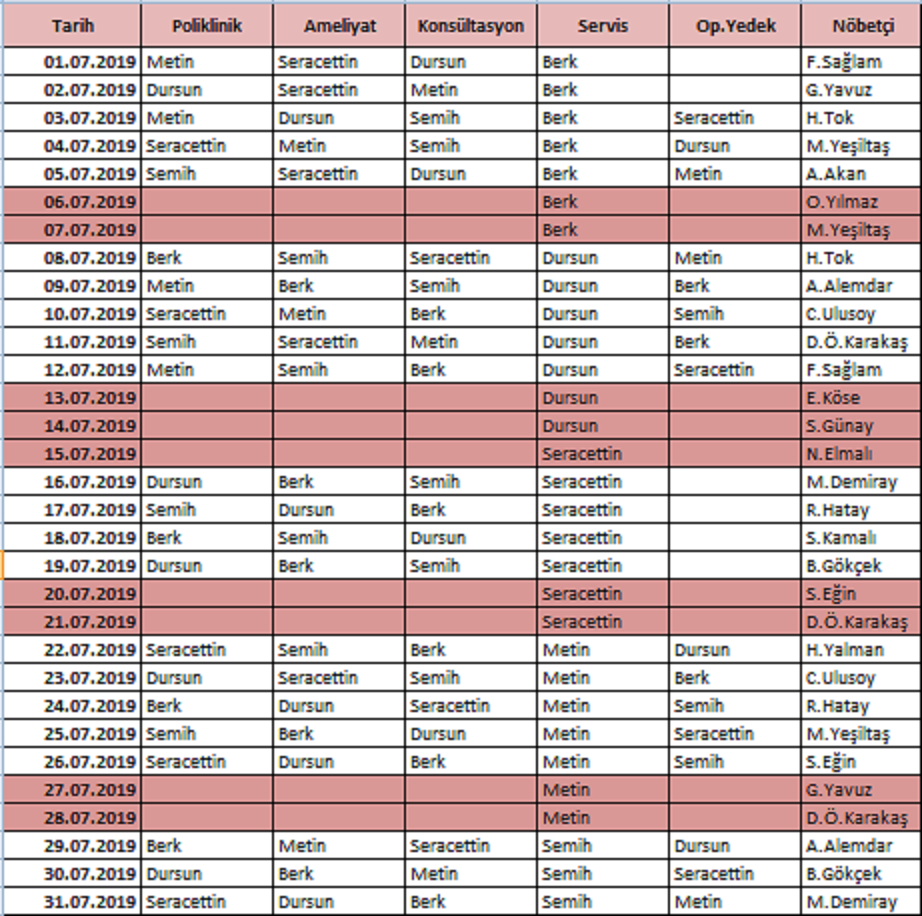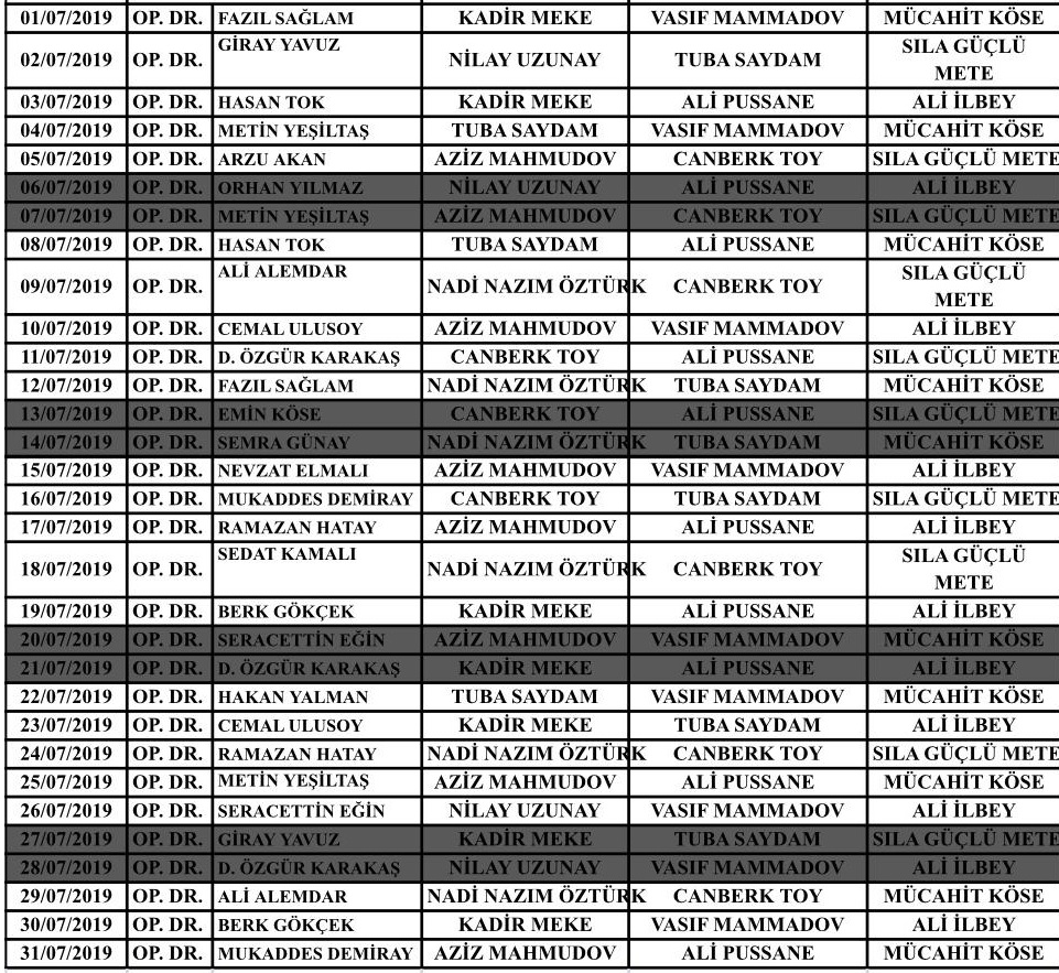 TEMMUZ 2019 ASİSTAN NÖBET PROGRAMI