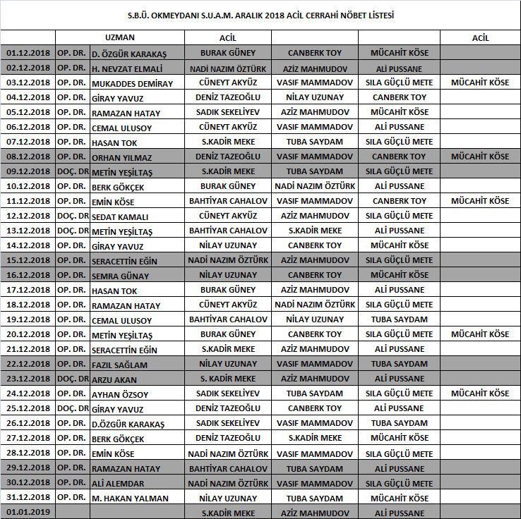 ARALIK 2018 ASİSTAN NÖBET PROGRAMI